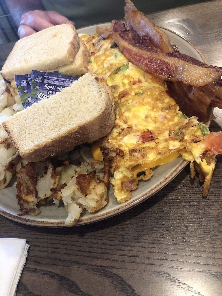Made with two eggs, hash browns, onions, and green peppers. Served with toast.