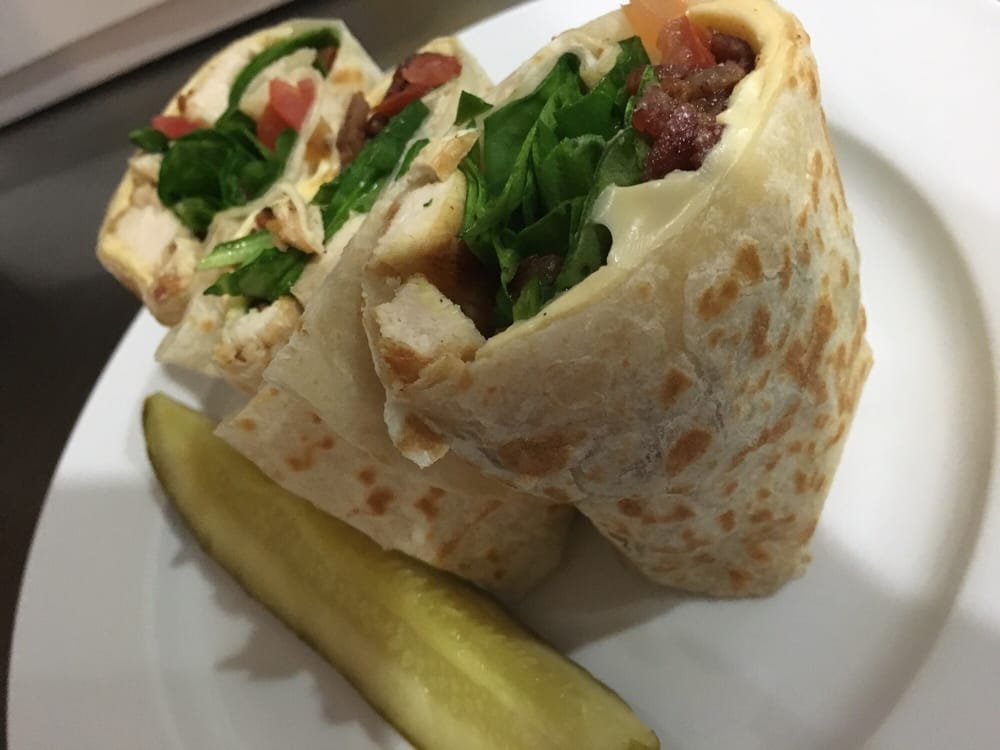 Crispy chicken, lettuce, tomato, Cheddar cheese. Tossed in wing sauce and ranch, rolled in a flour tortilla. Served with garnish, and your choice of fries or soup.